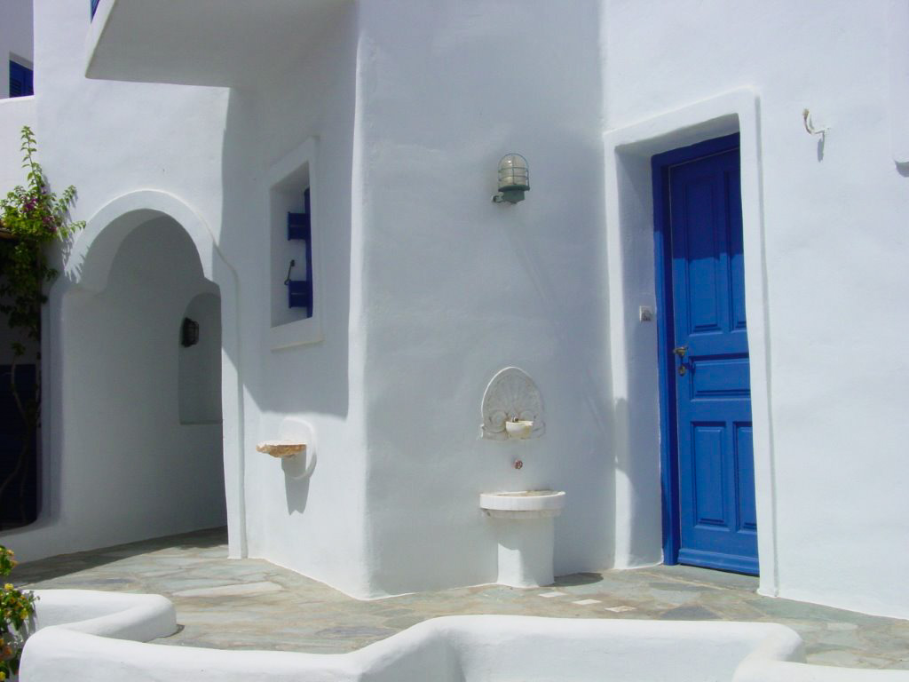 Curved walls and an archway soften the look of this traditional white-washed home on the island of Paros. It’s a place I’d like to call home.