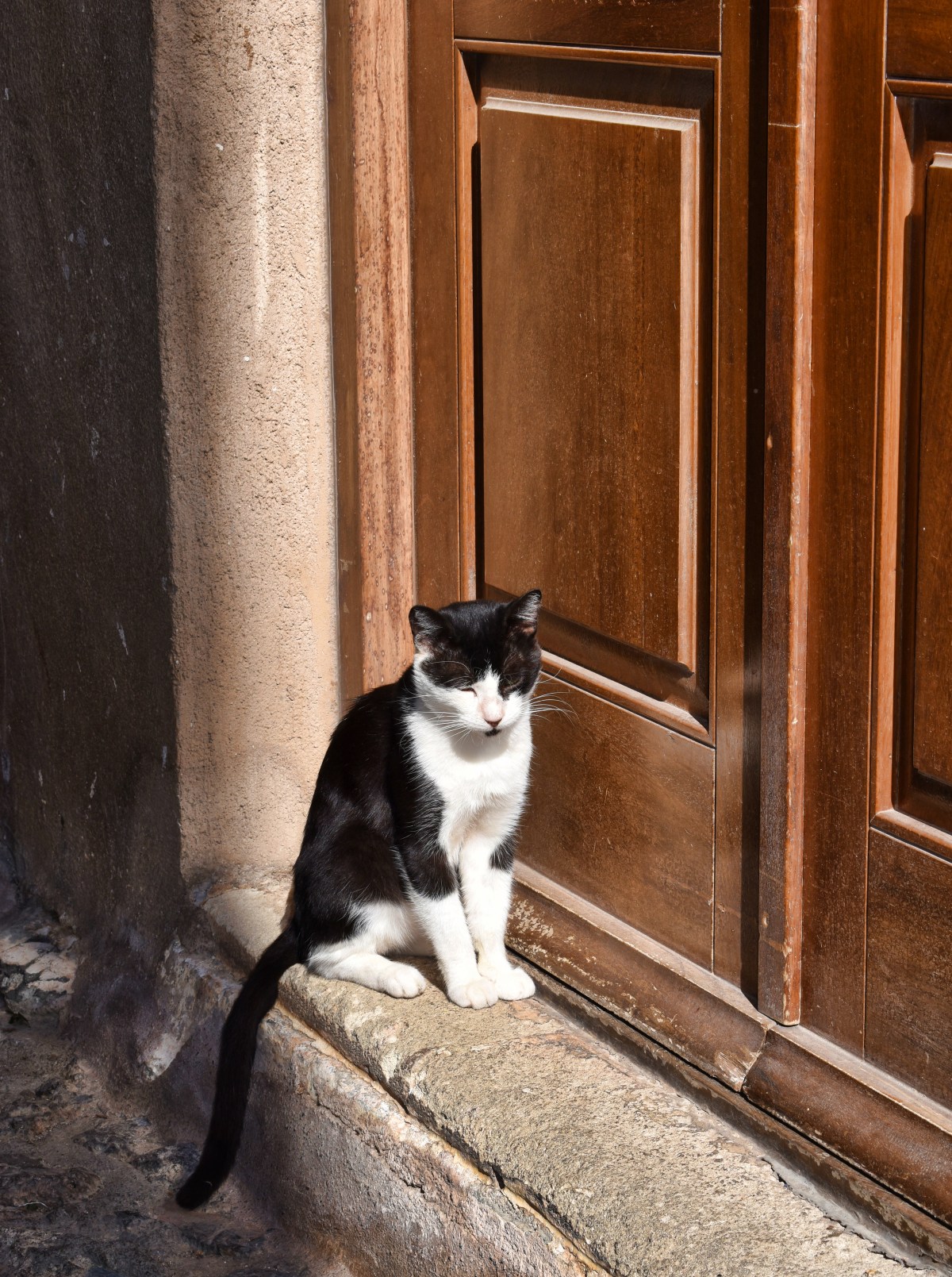 Ah, Monemvasia, one of my many favorite places in Peloponnese, Greece. This medieval fortress is cat-friendly and home to a small community of docile cats. As I strolled the narrow, cobblestoned lanes, I came across a variety of cats lounging near doors. What I found amazing was their indifference to my presence making it easy for me to snap their photos.
