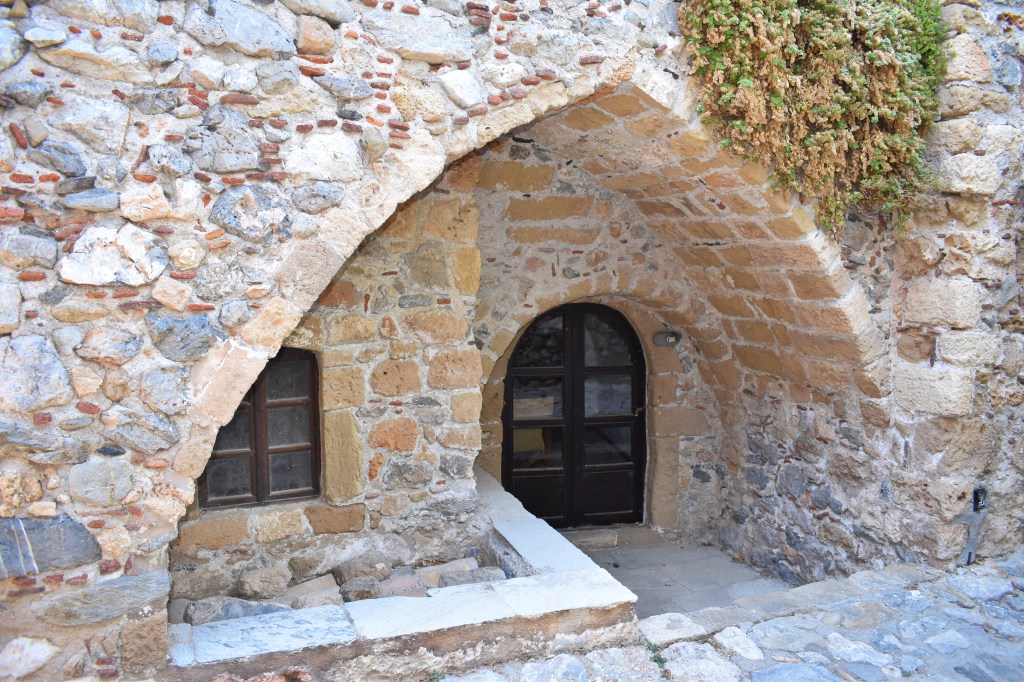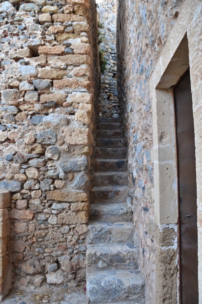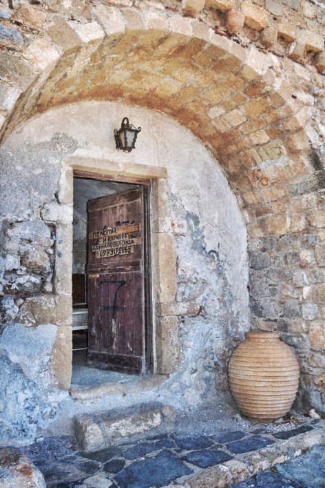When in Greece this past July, we spent an afternoon walking the narrow and surprisingly empty passageways of Monemvasia. We expected to encounter many tourists at this time of year, and felt blessed to have the place to ourselves. It gave me an opportunity to easily photograph many of the traditional stone structures characteristic of this Byzantine fortress. As evening approached, the town filled with tourists. Not a fan of crowds, it was time for us to move on.
